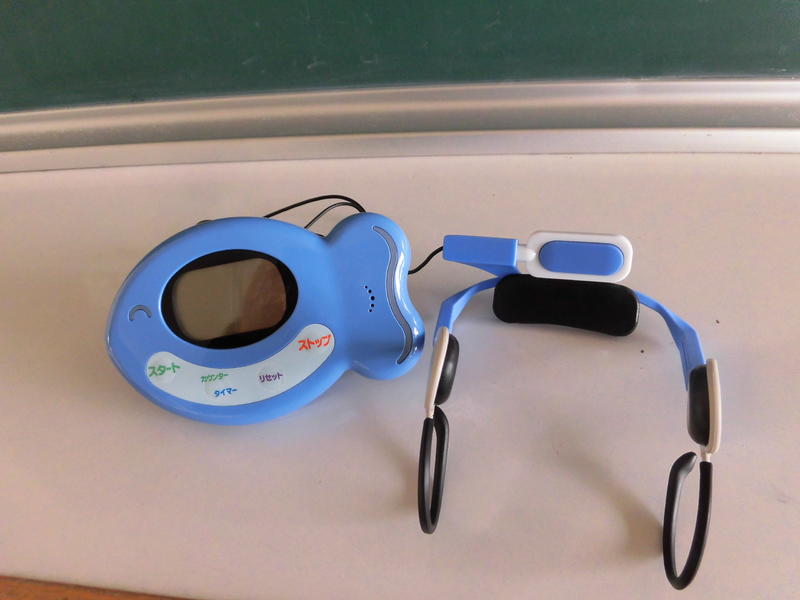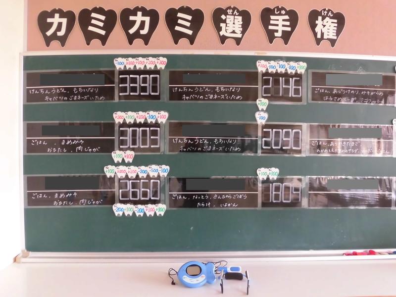 本校には、食事の咀嚼回数が分かるカミカミセンサーが3台あります。給食時にどれくらい咀嚼しているか、カミカミ選手権も行っています。手前に見えるのがカミカミセンサー。
