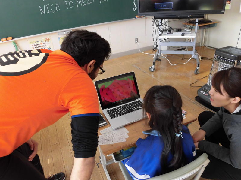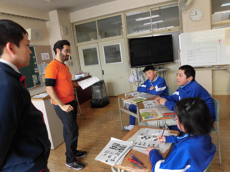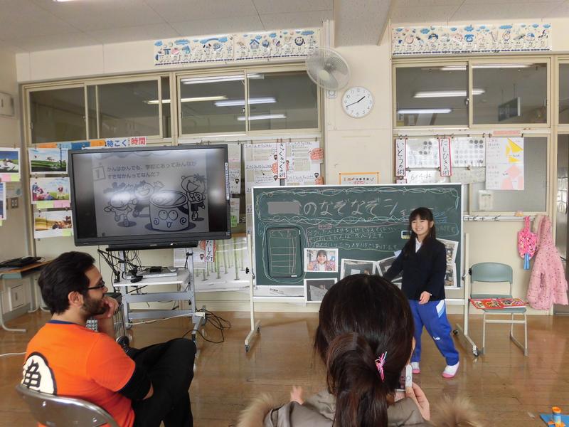 今日はALTさんとの授業。5・6年は聞き取りの力を高める内容、難しい顔をしています。