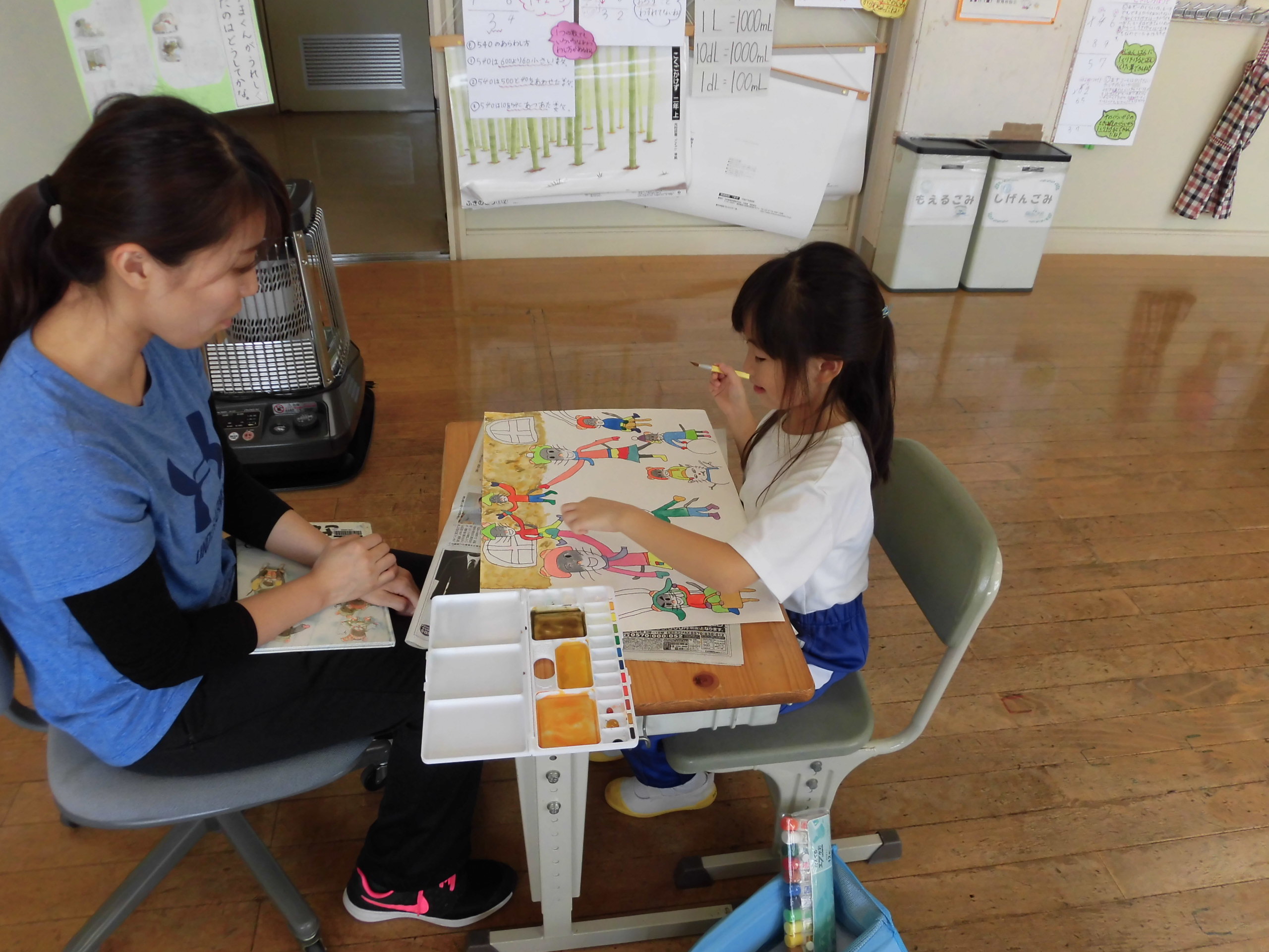 2年生は、担任と対話的に色づけ、楽しそうです。