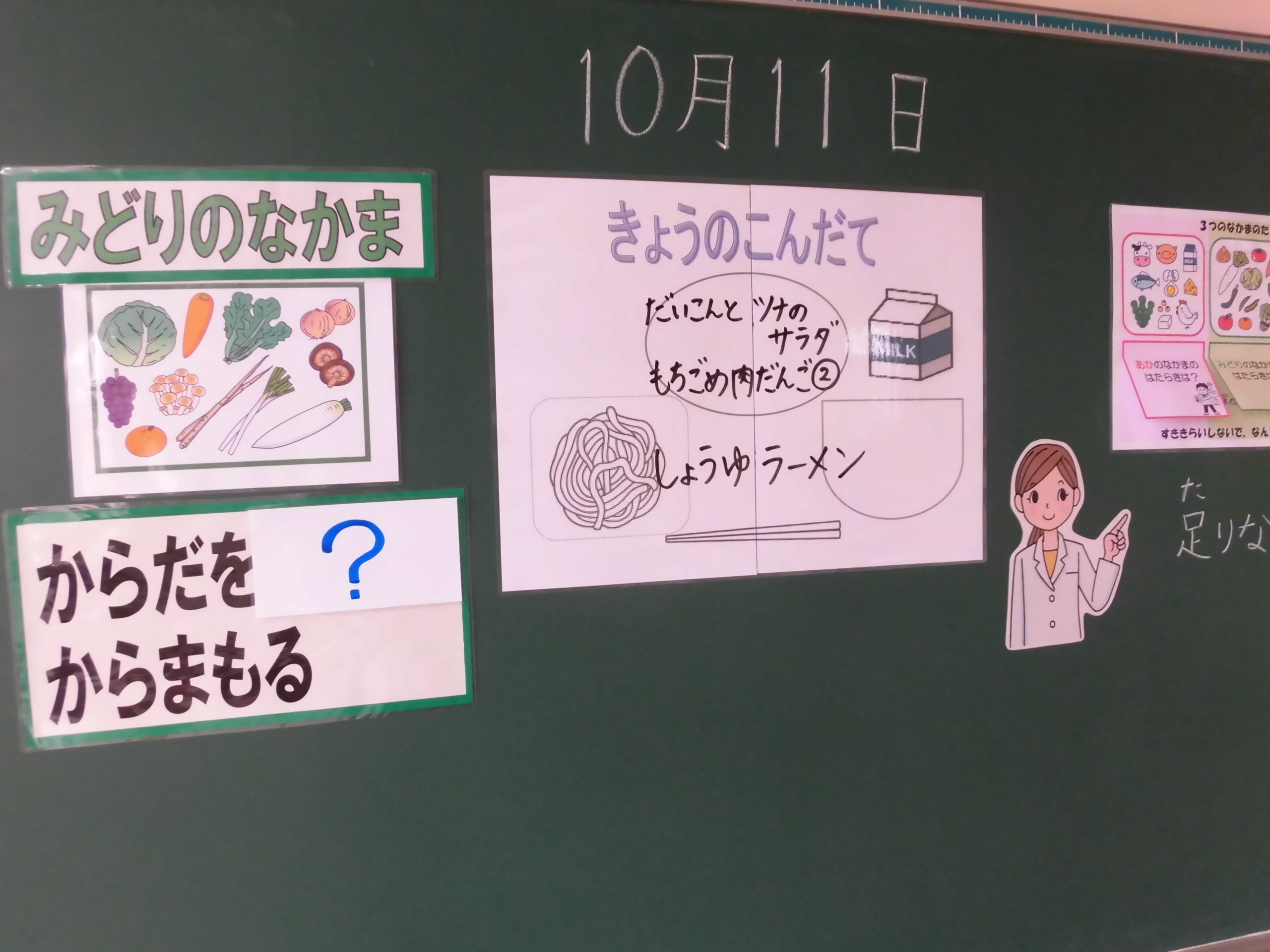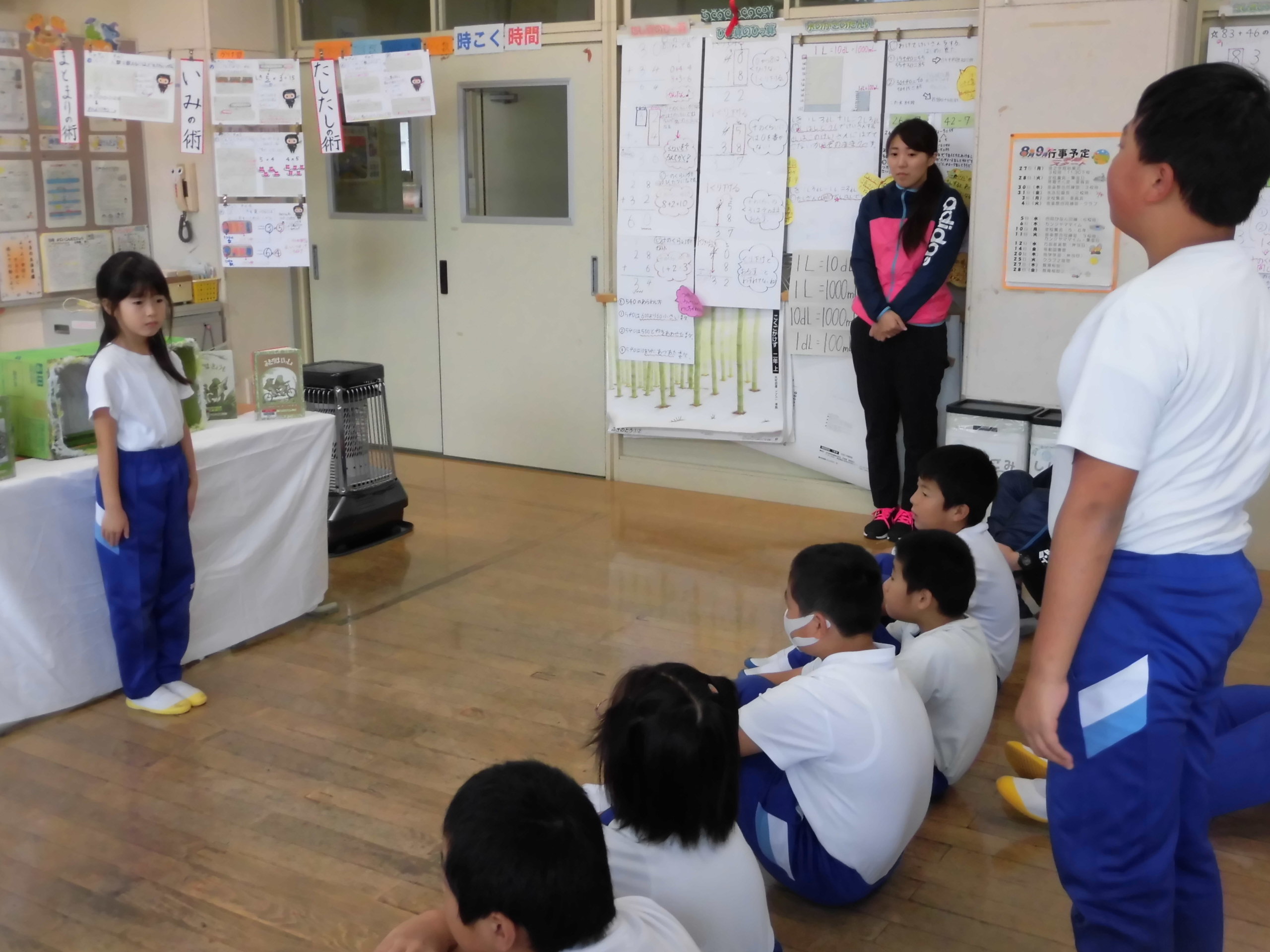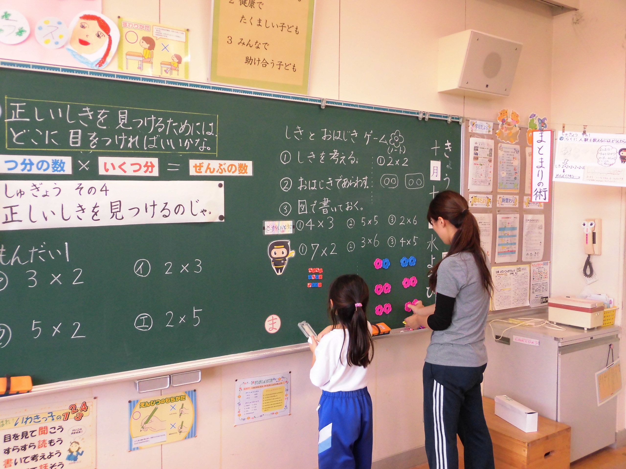 2年算数科の黒板には「修行4」、側面にはこれまでの修行で得られた「術」が書かれていました。