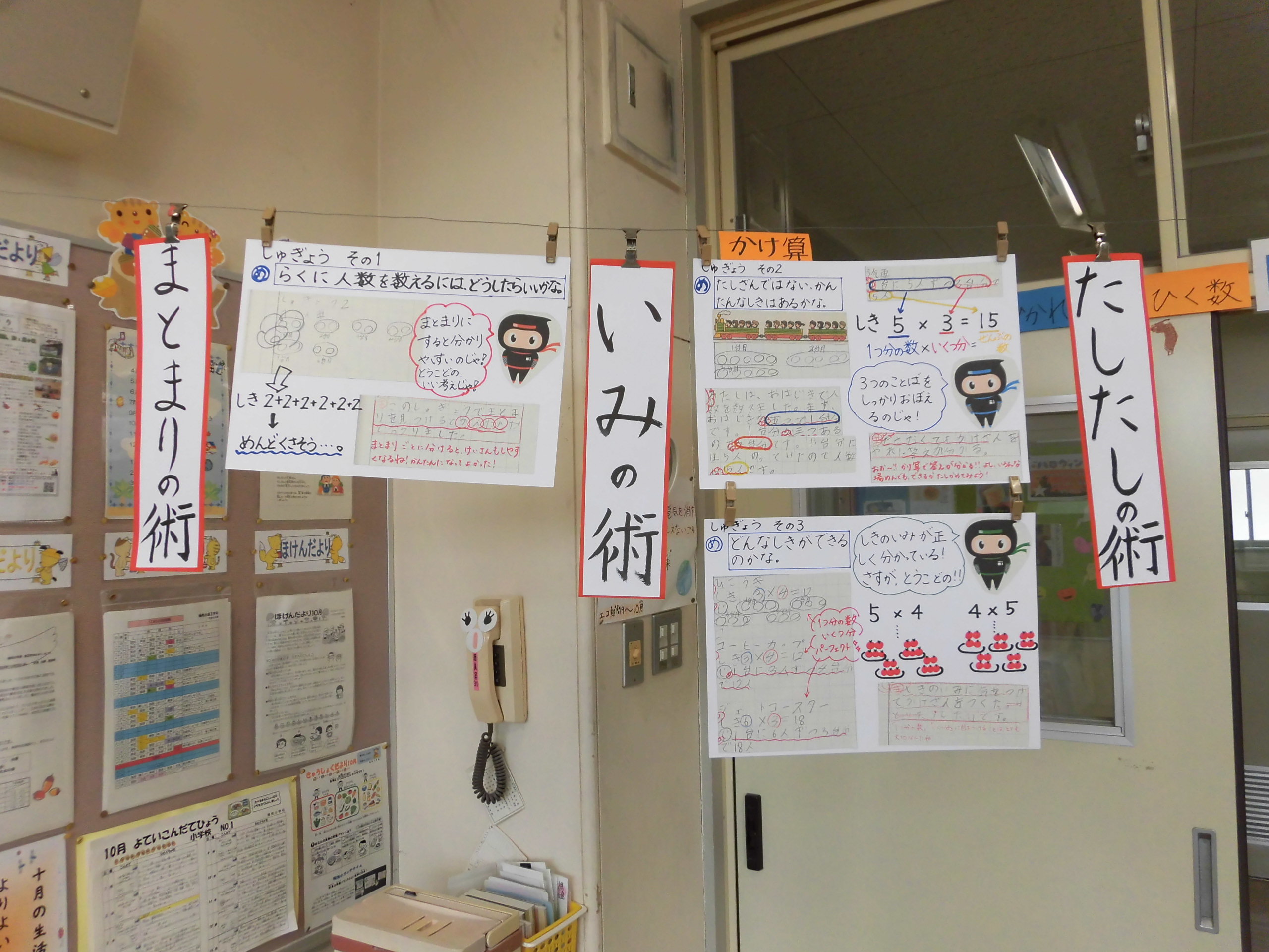 算数忍者のかけ算の修行と術の掲示。♪にんじゃりばんばんが聞こえてきそうな楽しげな掲示。
