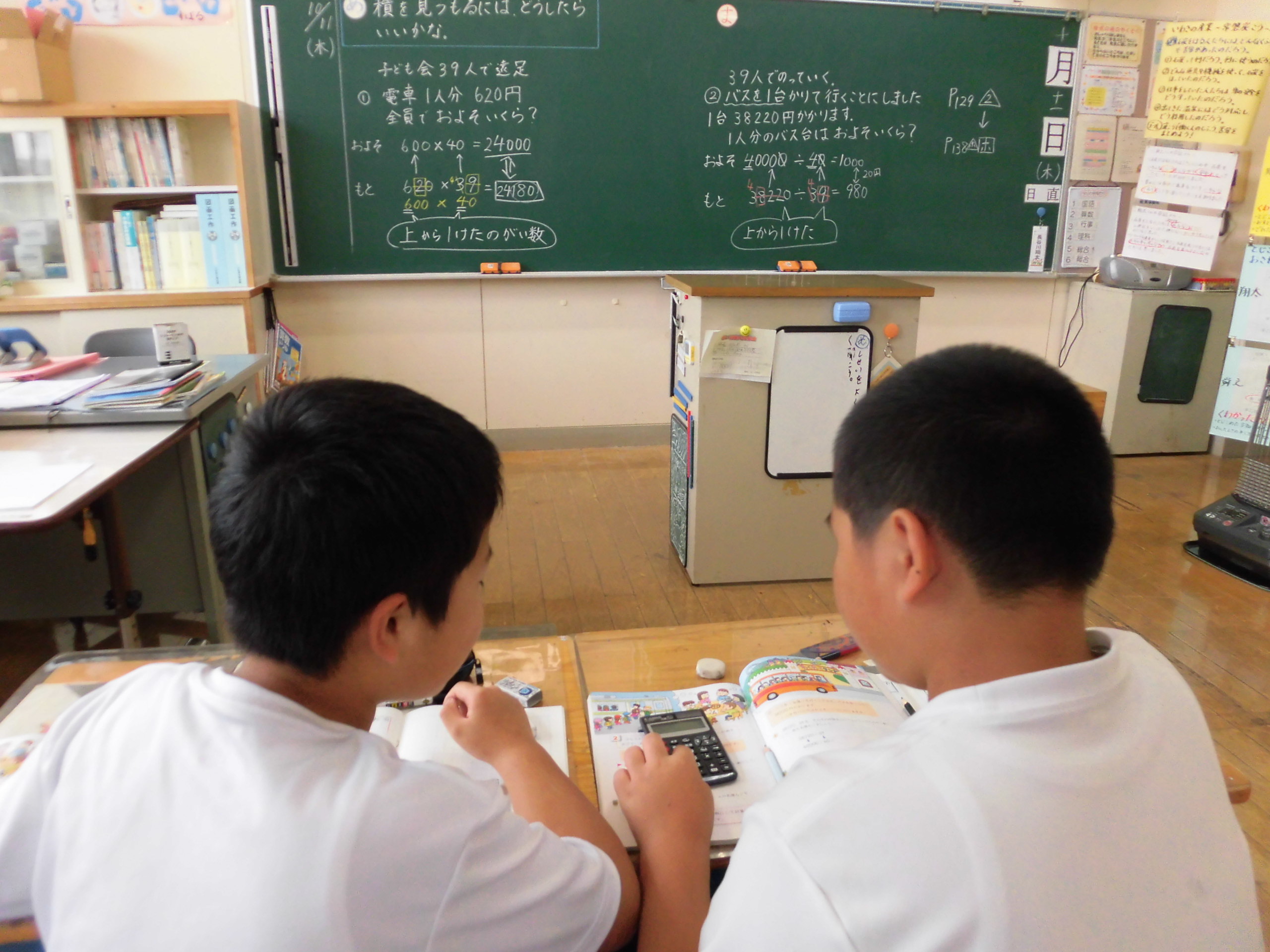 4年生は電卓を使って概算見積もりの確かめを行い、3年生は対話的に課題の焦点化を図っています。