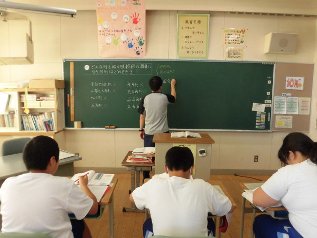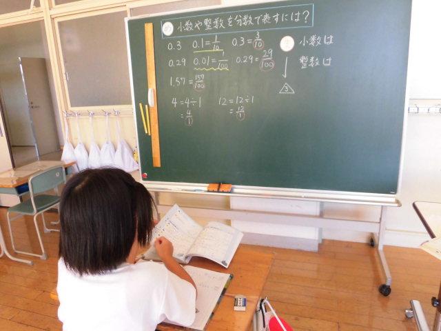 6年生は、どんなときも拡大図、縮図の関係になる図形探し。5年生は、小数・整数を分数へ。