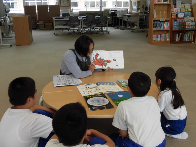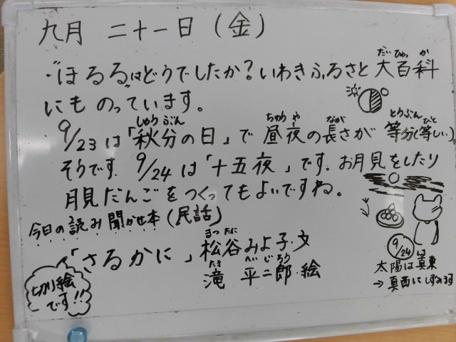 今日は松谷みよ子:文の「さるかに」の読み聞かせ。因果応報のテーマの他に、柿の実を何と見るかによって、現在の領土問題や貿易摩擦等々いろいろと考えさせられる内容でした。