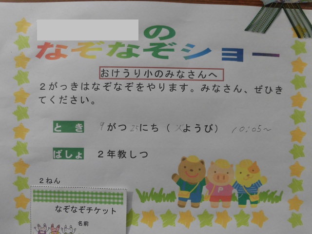 2年生がもってきてくれたチケットをもって、なぞなぞショーに向かいました。