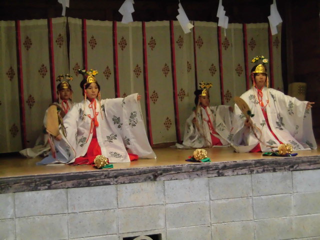 上は三十六矢の神事、下は桶売小中女子による浦安の舞。