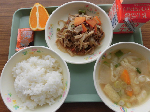 今日の給食は、根菜類たっぷりの呉汁や豚肉のうま煮、甘みの強いオレンジなどが出ました。元気百倍メニュー。