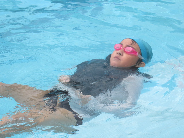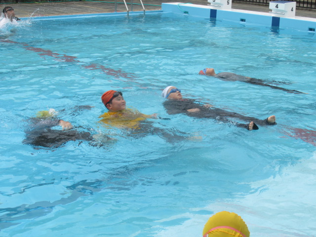 水泳記録会の後は、着衣水泳。水圧や泳ぎにくさを感じたり、長く浮く方法を学んだりしました。
