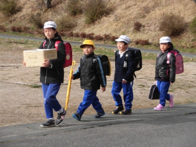 新1年生は、昨日から集団登校で歩いています。班の人たちに見守られ