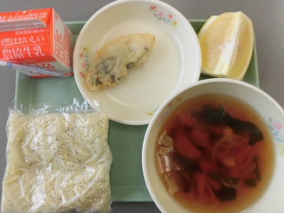 給食初日の献立は、しょうゆラーメン、牛乳、しろみ魚の天ぷら、