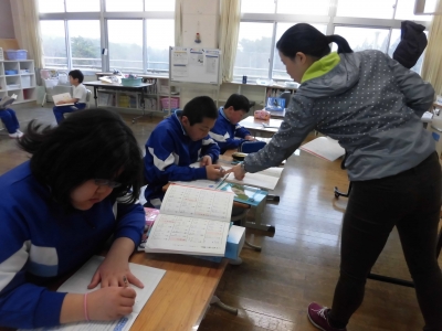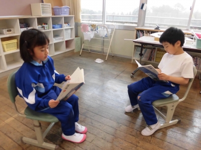 1・2年生は国語の授業です。2年生と一緒に1年生も、進んで学習