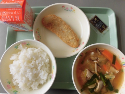 献立は、ささみチーズフライ、キムチチゲ、ソース、牛乳、ごはん でした。
