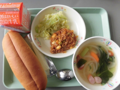 献立は、ドッグパン、牛乳、チリコンカン、ゆでキャベツ、ジャガイモの