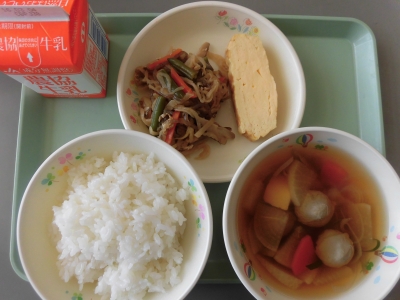 献立は、ごはん、牛乳、きりぼし大根のふくめに、厚焼きたまご、さん