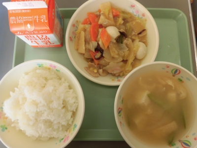 献立は、中華丼、じゃがいものみそ汁、ごはん、牛乳 でした。