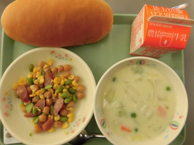 献立は、ひよこ豆ソテー、白菜のクリームシチュー、コッペパン、チョコクリーム