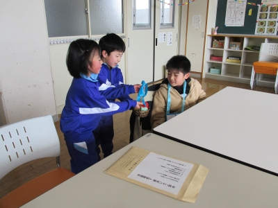 保護者説明会が開かれている頃,1・2年生が新入学児童のところへやってきました。