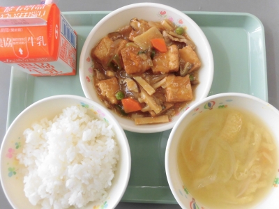 献立は、マーボー厚揚げ、ごはん、かぼちゃのみそ汁、牛乳 でした。