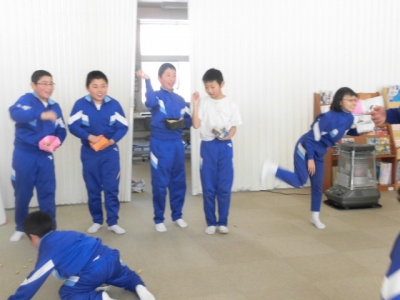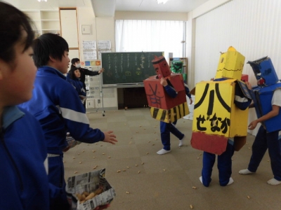5・6年生が豆まきの由来をクイズをまじえながら楽しい劇にして演じて
