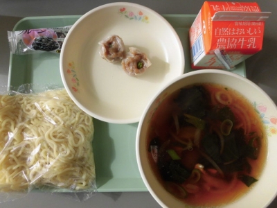 献立は、しょうゆラーメン、牛乳、ポークしゅうまい、プルーンでした。