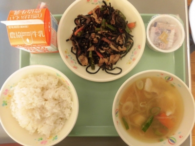 献立は、麦ごはん、牛乳、納豆、ひじきの油いため、どさんこ汁 でした。