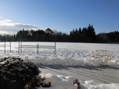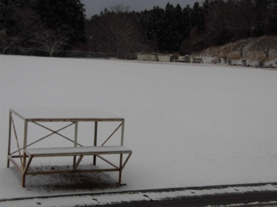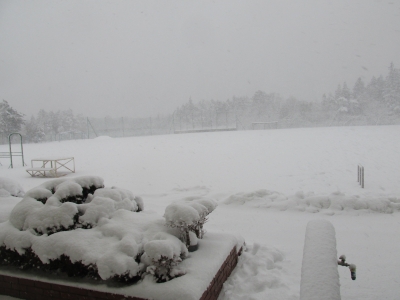 今朝、学校の校庭にはうっすらと雪が積もっていました。