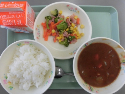 献立は、ごはん、牛乳、ブロッコリーソテー、ハヤシライス でした。
