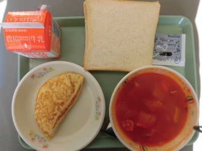 献立は、食パン、牛乳、オムレツ、ポークビーンズ、ブルーベリージャム