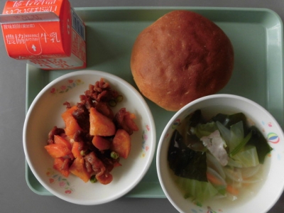 献立名は、クリームパン、牛乳、あまからポテト、野菜スープ でした。