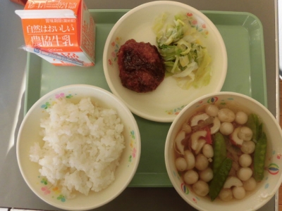 献立は、ごはん、牛乳、ソースかつどん、ゆでキャベツ、こづゆ でした。