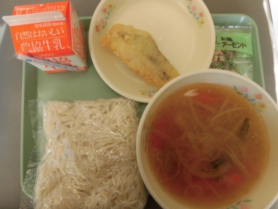 献立は、みそかけうどん、牛乳、白身魚の天ぷら、小魚アーモンド