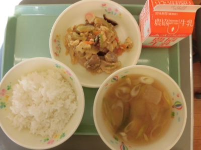 今日は、おやこ煮、さつまいものみそ汁、ごはん、牛乳 でした。