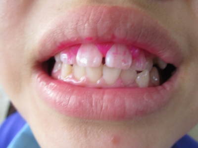 今日の給食後は、2か月に1回行っている歯の汚れ検査を実施しました。