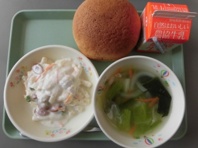 今日は、メロンパン、牛乳、とり肉とマカロニのクリーム煮、野菜スープ