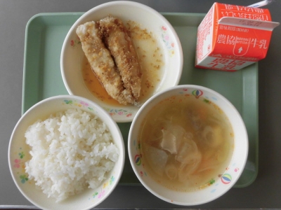 今日は、いわしのあげびだし、いなか汁、ごはん、牛乳 でした。