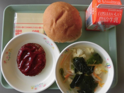 今日は、バーガーパン、牛乳、ハンバーグ、イタリアンスープ、スライスチーズ