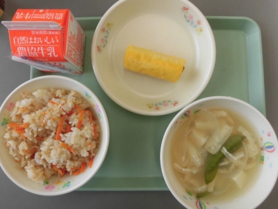 今日は、ツナごはん、牛乳、あつまき卵ウインナー、じゃがいものみそ汁