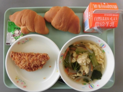 今日は、ハムサラダフライ、バターロール、小松菜と卵のスープ、マーガリン
