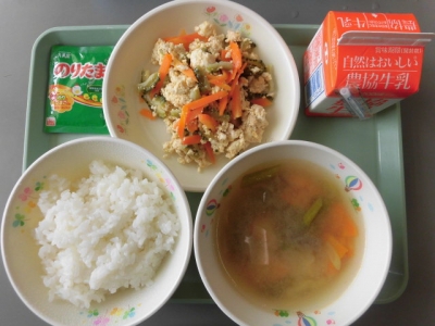 今日は、ゴーヤチャンプル、みそけんちん汁、ごはん、牛乳、たまごふりかけ