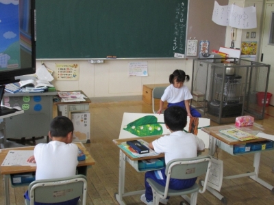 本日、国語の授業で2年生が、「はらぺこあおむし」の読み聞かせとクイズを行いました。