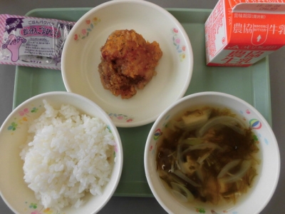 今日は、チキンガーリックソースかけ、アーサー汁、ごまひじき、牛乳、ごはん