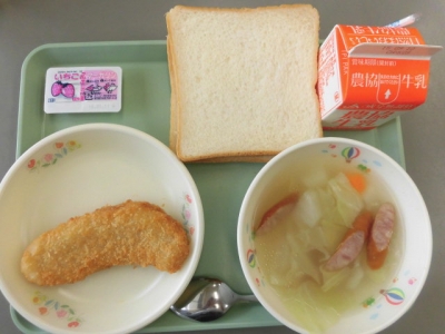 今日は、ささみチーズフライ、ポトフ、食パン、いちご&マーガリン、牛乳