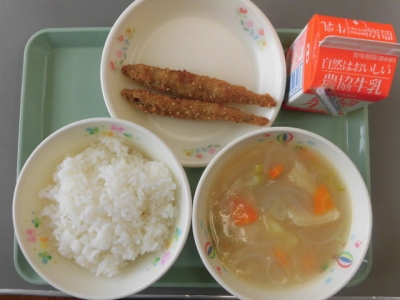 今日は、ししゃもごまフライ、ごはん、呉汁、牛乳 でした。