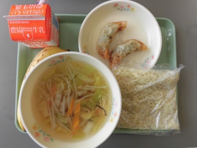 今日は、塩ラーメン、しそぎょうざ、牛乳、バナナ でした。