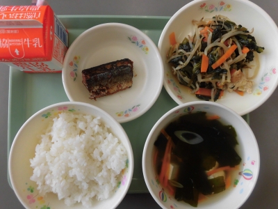 わかめスープ、小松菜と厚揚げのにびたし、さんまかつおぶし、牛乳、ごはん