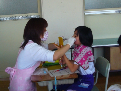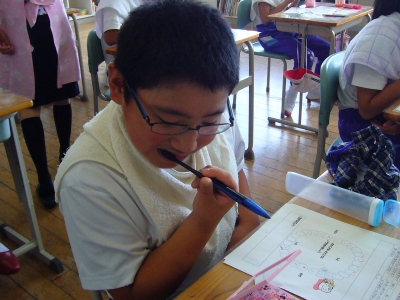 歯みがきの個別指導を受けている4年生