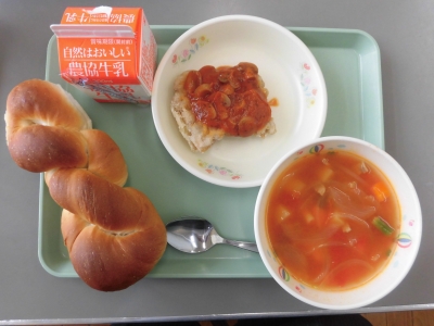 今日は、ねじりパン、鶏肉のブレゼ、ミネストローネ、牛乳 でした。