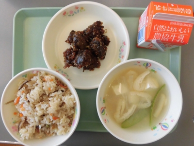 今日は、ごもくごはん、レバーの南蛮漬け、だいこんのみそ汁、牛乳 でした。