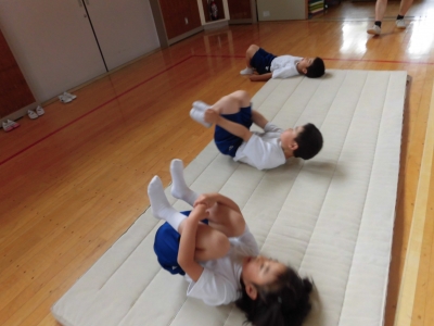 1・2年生は体育の学習で、マット遊びの運動に進んで取り組んでいました。
