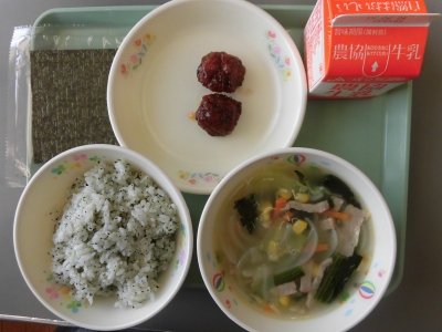 今日は、手巻きのり、ミートボールあまずあんかけ、かおりごはん、野菜スープ